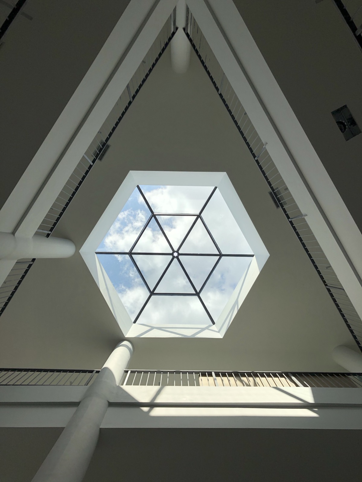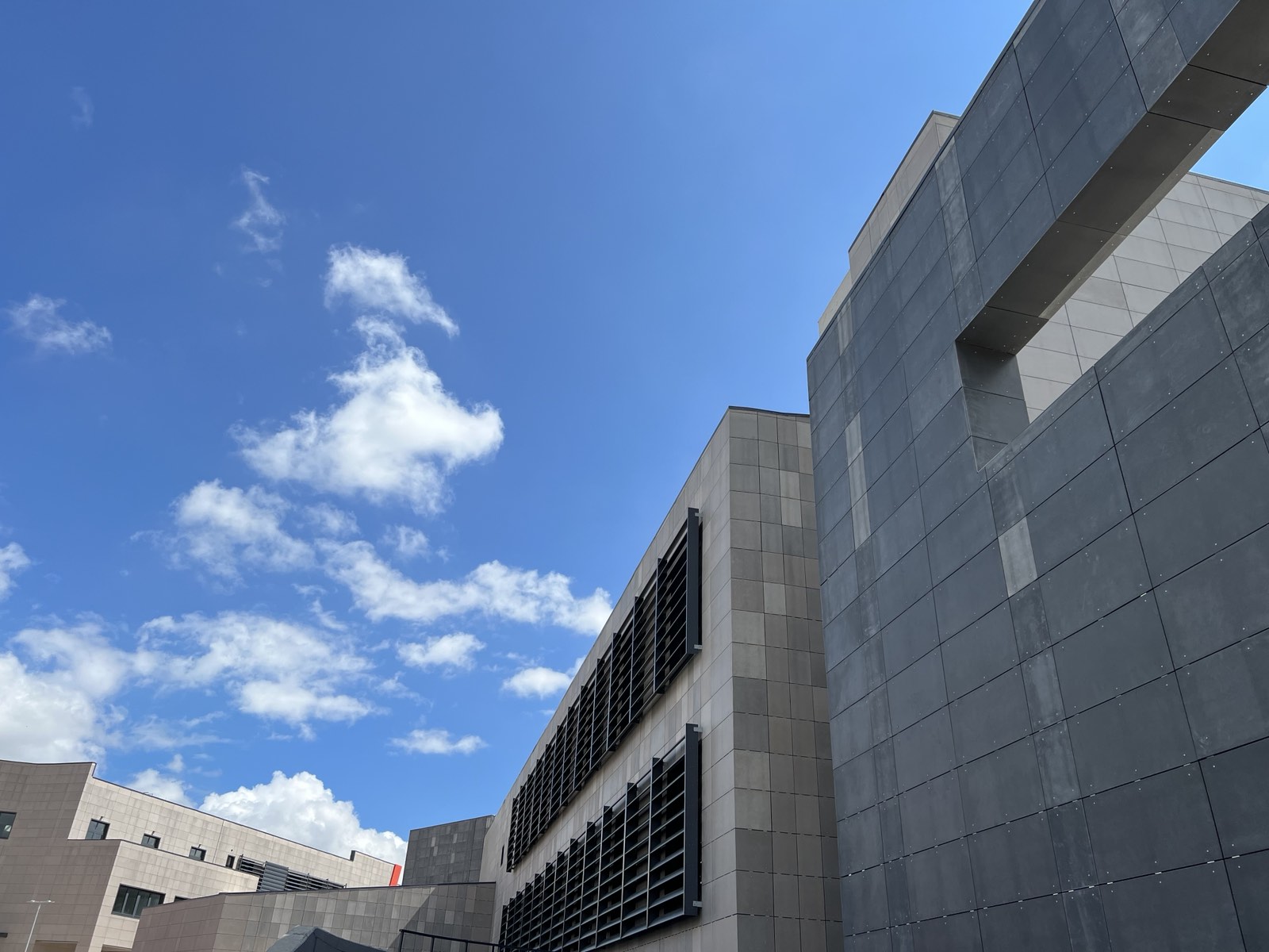 Το κτιριακό συγκροτήματα των Σχολών αποτελείται από τρείς διακριτούς κτιριακούς όγκους, από τους οποίους ο ένας (κεντρικός) καλύπτει ανάγκες διοίκησης (γραφεία) και αναπτύσσεται σε τρία επίπεδα, ενώ οι άλλοι δύο καλύπτουν εκπαιδευτικές ανάγκες (αίθουσες διδασκαλίας, εργαστήρια) και αναπτύσσονται σε δύο επίπεδα. Ο κεντρικός κτιριακός όγκος συνδέεται με του άλλους δύο μέσω στεγασμένων διαδρόμων. Οι τρείς κτιριακοί όγκοι καλύπτουν τρεις προσανατολισμούς (βορρά, ανατολή και νότο) δημιουργώντας ένα σημαντικού μεγέθους οριοθετημένο ελεύθερο χώρο αφήνοντας μόνο τη δυτική πλευρά ανοιχτή προς τον κεντρικό χώρο πρασίνου της πανεπιστημιούπολης, που προβλέπεται από το εγκεκριμένο χωροταξικό σχέδιο. Στην ανατολική πλευρά και μπροστά από τον κεντρικό κτιριακό όγκο των γραφείων, αφήνεται σημαντικός χώρος υποδοχής που συνδέεται, μέσω συγκεκριμένων στοιχείων διαμόρφωσης πεζοδρόμων, με το κτίριο διοίκησης στα βορειοανατολικά. Για την εξυπηρέτηση των χρηστών προβλέπονται: ένας ανοιχτός χώρος στάθμευσης 162 θέσεων στο νότο σε μια έκταση περίπου 7000μ², σε μικρή απόσταση από τα κτίρια, χώροι πρόσβασης στα τρία κτίρια με σκάλες και ράμπες, περιφερειακός διάδρομος κίνησης πεζών, μήκους περίπου 600μ, στα δυτικά του συγκροτήματος που ενώνεται με μια ημικυκλική χάραξη με τον εσωτερικό οδικό δακτύλιο στο ύψος των δύο χώρων στάθμευσης στο βορρά και νότο και που μπορεί να μετατρέπονται σε δρόμο κίνησης οχημάτων έκτακτης ανάγκης, όταν προκύπτει πρόβλημα, καθώς και για τροφοδοσία των δύο κτιρίων των σχολών, εξωτερικό χώρο εξυπηρέτησης του κυλικείου, ανοιχτός χώρος στη ανατολική πλευρά του κεντρικού κτιρίου υποδοχής που έρχεται σε άμεση επαφή με τον εσωτερικό οδικό δακτύλιο και προορίζεται για ποικίλες δραστηριότητες (σχετική αναφορά στις επόμενες παραγράφους), δύο σημαντικοί ελεύθεροι χώροι ο πρώτος στα βόρεια (έκτασης περίπου 11500μ²), που ορίζεται από τον βόρειο χώρο στάθμευσης, την πτέρυγα 1 του συγκροτήματος και τον περιφερειακό ημικυκλικό διάδρομο και ο δεύτερος στα νότια (έκτασης περίπου 9000μ²), που ορίζεται από τον νότιο χώρο στάθμευσης, την πτέρυγα 3 του συγκροτήματος και τον περιφερειακό ημικυκλικό διάδρομο.